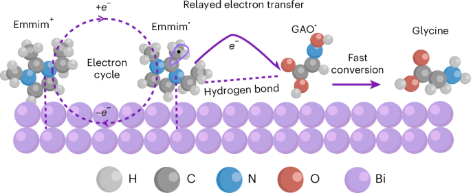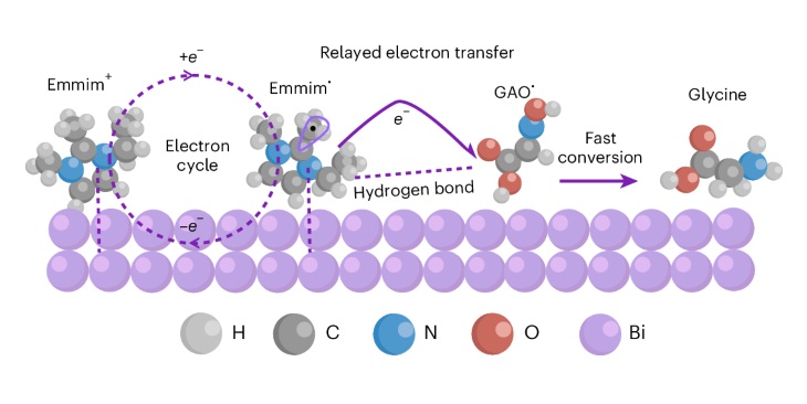 利用草酸和硝酸盐/空气作为原料电化学合成氨基酸是绿色化学与可持续合成领域的前沿方向。甘氨酸在医药、食品和化工等行业中具有广泛应用。然而,甘氨酸电合成过程涉及复杂且缓慢的电子和质子转移过程,特别是关键中间体乙醛酸肟的转化速率缓慢,导致产物选择性和产率偏低。因此,高效地促进电子转移过程成为该领域发展的关键。在国家自然科学基金委、科技部、中国科学院和北京分子科学国家研究中...