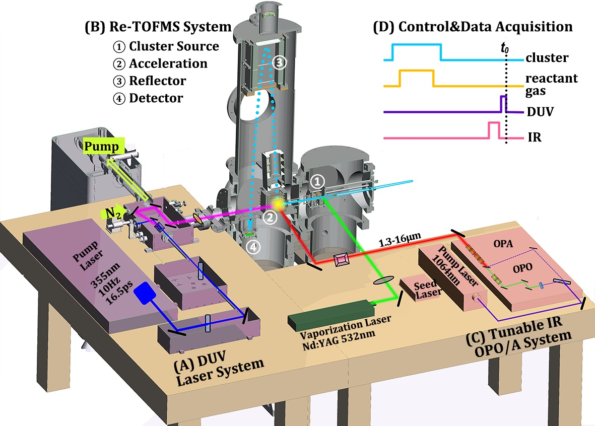 在国家重大科研装备深紫外(二期)项目支持下,团队设计研制了国际上第一台高灵敏度深紫外/红外离子化检测质谱光谱仪(DUV+IR TOFMS-VMI),建立了全固态深紫外DUV激光高效免碎片电离方法 [Rev. Sci. Instrum. 2019, 90, 073101],实现了反射式飞行时间质谱与团簇流动反应及其光电子速度成像的技术联用 [Int. J. Mass Spectrom. 2022, 482, 116932 ],能够同时测试物质元素组成与化学结构,探究团簇物种的反应活性。